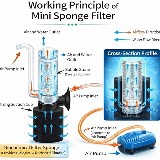 - SAFE FOR DELICATE FISH: High-density biochemical filter sponge provides biological and mechanical filtration, removes debris and impurities, maintains water clarity, and prevents small fish, shrimp, and fry from being sucked in.