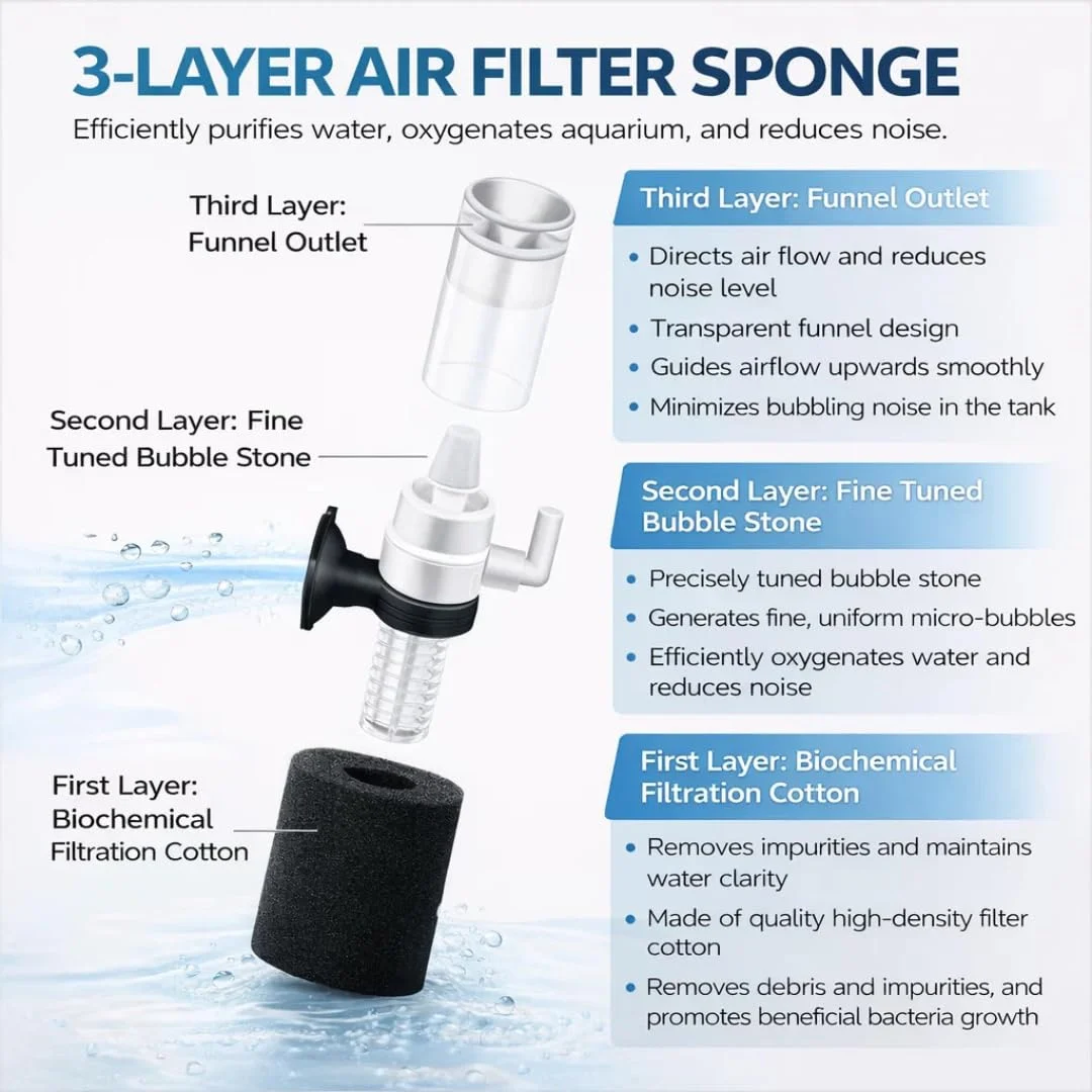 - 3-IN-1 MULTI-FILTRATION SYSTEM: Combines biochemical filtration cotton sponge, fine-tuned bubble stone for efficient oxygenation, and funnel air outlet for smooth water circulation whilst reducing noise levels